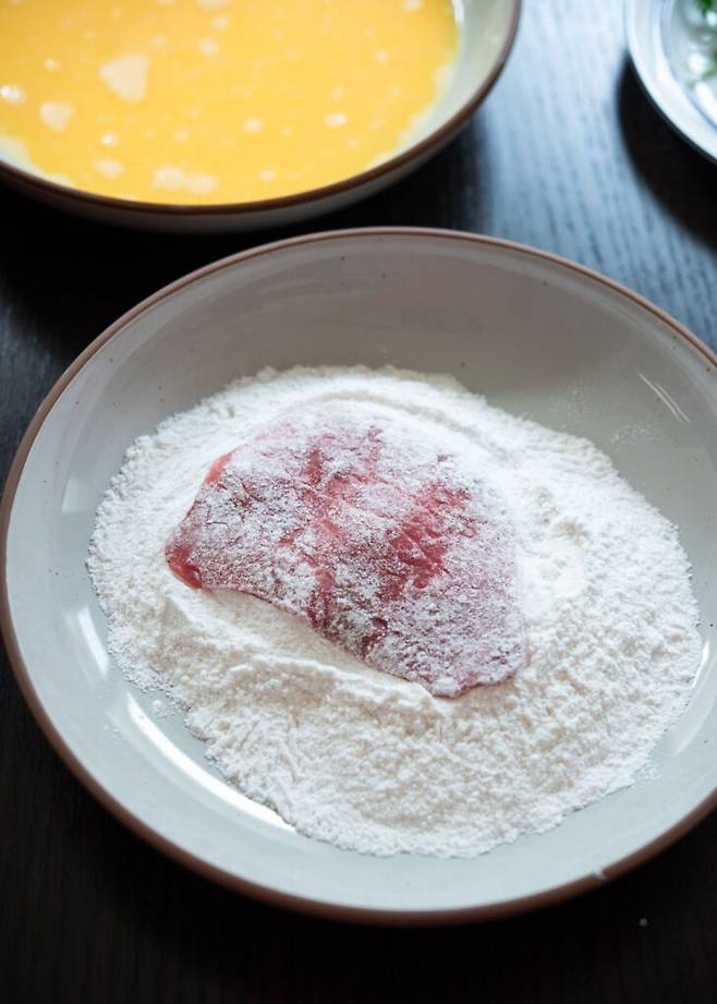 2. 고기에 밀가루를 얇게 묻히고, 잘 털어 과하게 묻지 않도록 한다.