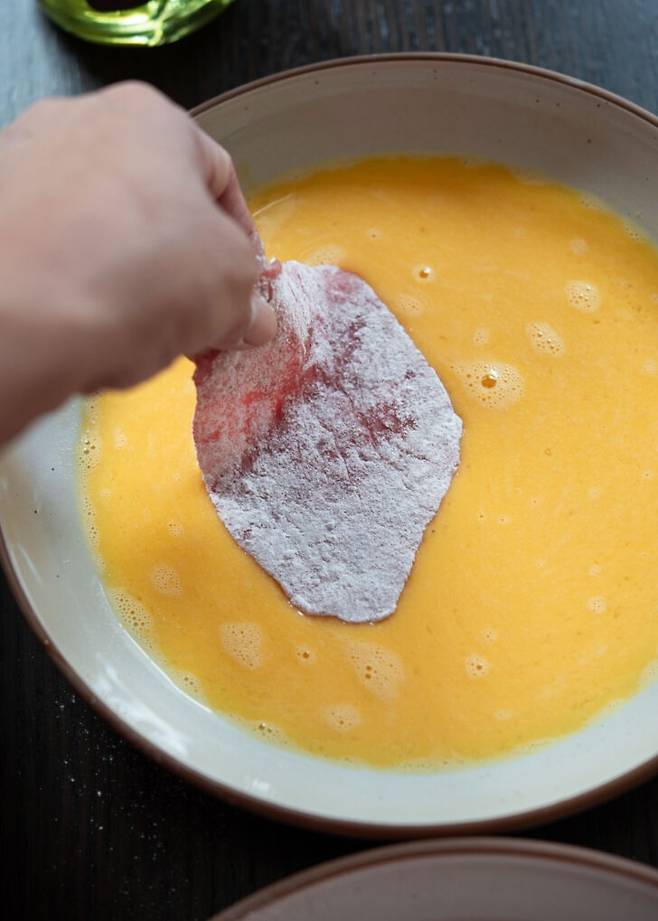 3. 달걀을 풀어 준비하고, 고기를 달걀물에 골고루 적신다.
