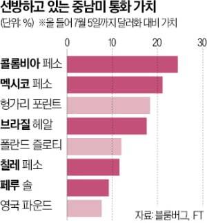 파이낸셜타임스(FT)는 5일(현지시간) "초인플레이션, 디폴트(채무 불이행) 등으로 골머리를 앓고 있는 아르헨티나를 제외하면 중남미 주요국의 경제 성적표는 매우 양호하다"며 "콜롬비아 멕시코 브라질 칠레 페루는 달러화 대비 통화 가치가 올해 세계 상위 8개 통화 목록에 들었을 정도"라고 보도했다.