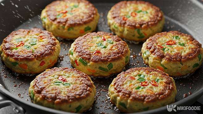 달군 기름 위에 반죽을 올리고, 숟가락으로 가운데 부분을 눌러서 둥글고 납작한 모양을 만든다. 앞뒤로 뒤집어가며 기름에 튀기듯이 구워내면, 노릇하고 바삭한 동그랑땡이 완성된다.