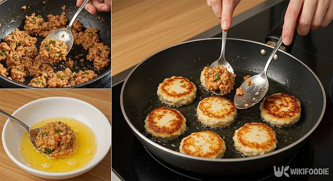 5. 반죽을 숟가락으로 떠서 숟가락 두 개로 모양을 잡고 계란물에 담가 입힌 후, 달군 기름에 올려둔 반죽을 눌러서 납작한 모양으로 만든다.