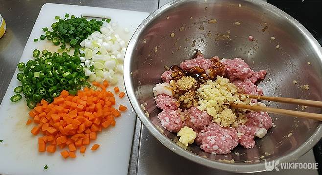 먼저 대파와 청양고추는 반 갈라 송송 썬다. 당근은 잘게 다져 준비한다. 볼에 간 돼지고기 지방과 간 돼지고기, 간 마늘, 진간장, 황설탕, 대파, 청양고추, 당근을 넣고, 젓가락 4~5개를 잡고 한 방향으로 계속 저어주며 반죽을 골고루 섞어준다.