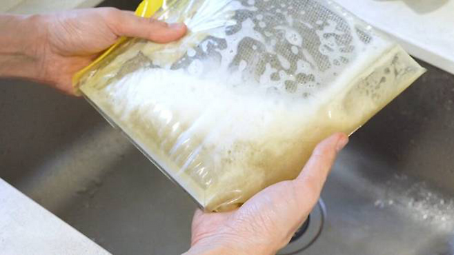 준비된 지퍼백을 약 1분 정도만 흔들어주면, 안에 있던 물이 빠르게 탁해지는 것을 확인할 수 있다. 이는 베이킹소다와 세제가 뜨거운 물과 만나 기름때를 분해하면서, 필터에 붙어 있던 오염물이 떨어져 나오는 과정이다.