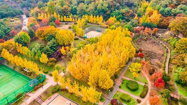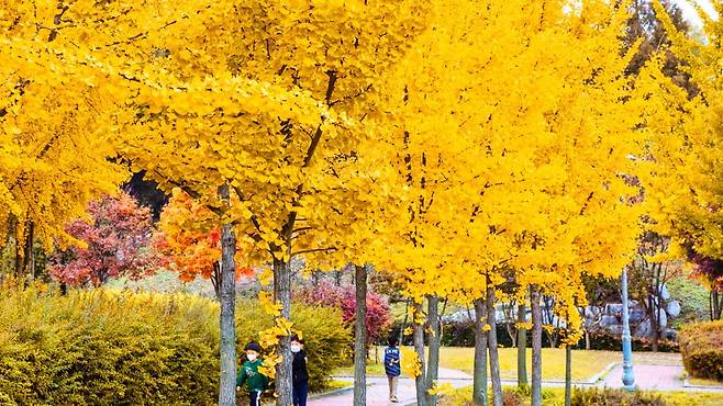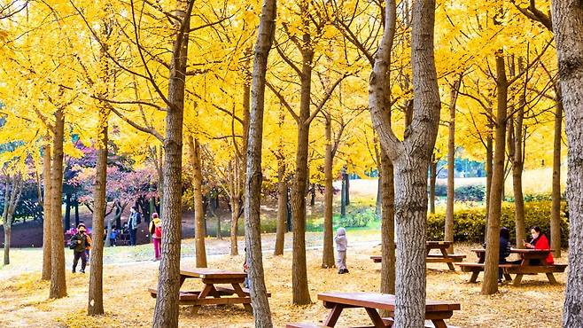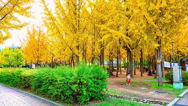 가을철 이 공원을 찾는 가장 큰 이유는 단연 은행나무숲입니다. 숲길을 따라 천천히 걷다 보면 온 사방이 노랗게 물들어, 마치 황금빛 안개 속을 걷는 듯한 착각이 듭니다.
