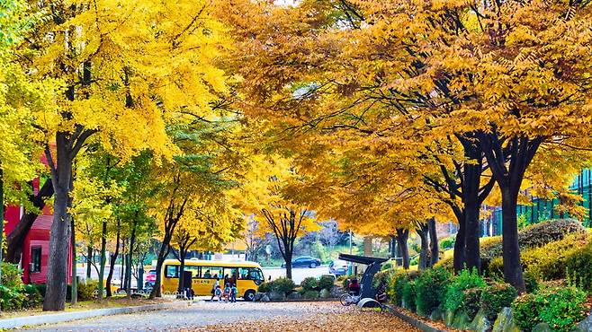 아파트와 도로 사이, 불과 몇 걸음만 옮기면 눈앞에 펼쳐지는 거대한 황금빛 숲길.