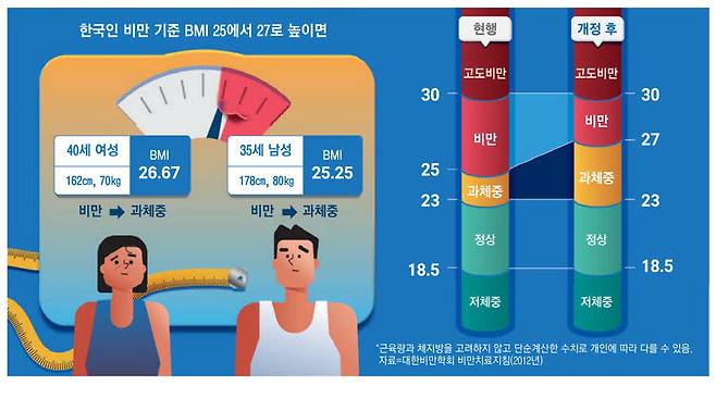 우리나라의 경우 세계보건기구(WHO) 서태평양지역 기준에 따라 BMI가 18.5~22.9 사이면 '정상', 23~24.9면 '비만 전 단계'(위험체중·과체중), 25 이상이면 '비만'으로 분류한다. 비만 판정 기준을 27로 높이면 키 162㎝·몸무게 70㎏ 여성과 키 178㎝·몸무게 80㎏ 남성도 '뚱뚱'이 아닌 '통통'으로 봐야 한다.