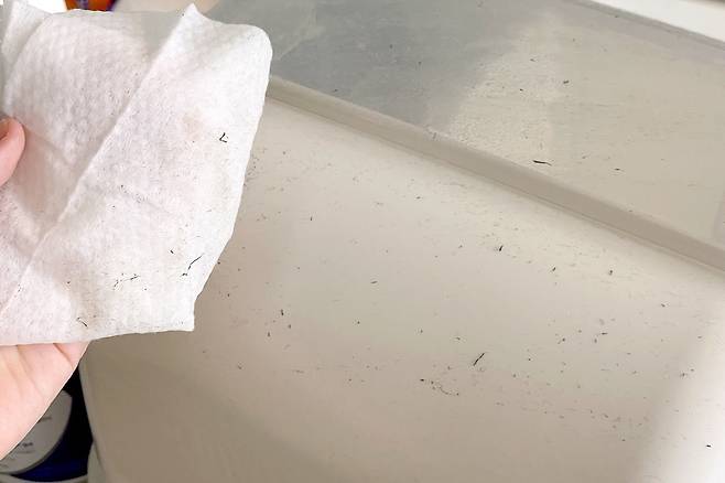 휴지로도 물티슈로도 잘 닦이지 않는 먼지가 있죠. 섣불리 닦으려 도전했다가는 먼지가 뭉쳐 오히려 더 더러워지는 경우가 많은데요. 이럴 때는 티슈에 손소독제를 묻혀 닦아보세요. 먼지 뭉침 없이 깔끔하게 닦인답니다.