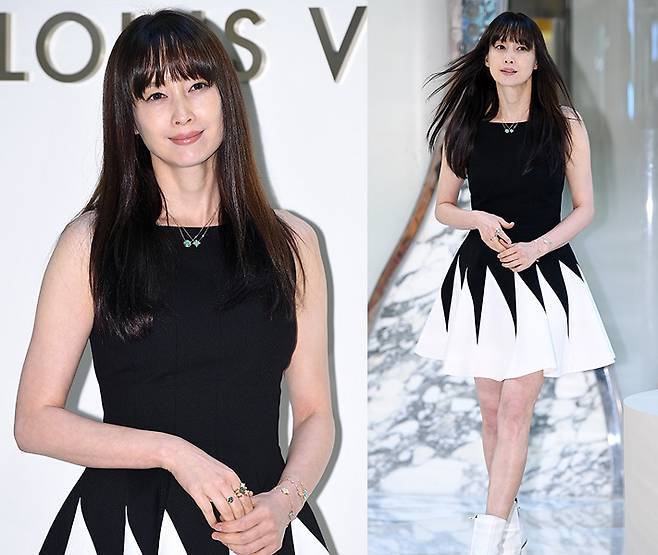 이나영은 블랙과 화이트가 날카롭게 대비되는 플레어 미니드레스에 하얀 앵클부츠를 매치해 런웨이에 선 듯한 강렬한 아우라를 발산했습니다.