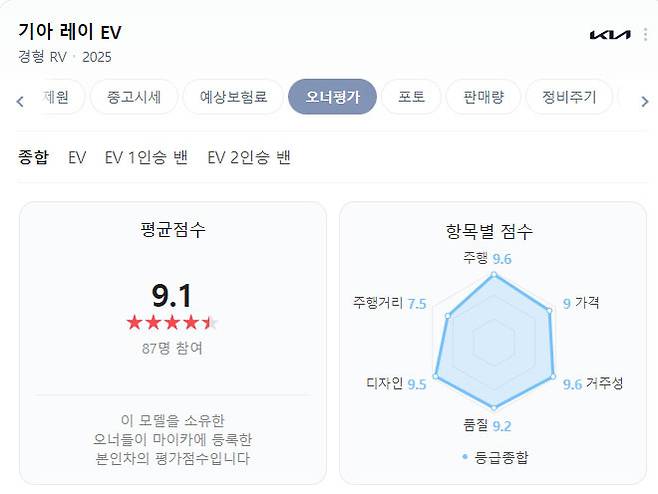 실제 차량 소유주들의 차량 평가 데이터를 취합한 네이버 마이카 오너 평가에 따르면 기아 레이 EV 차주들이 평가한 평균 점수는 9.1점으로 높은 평가를 받았다.