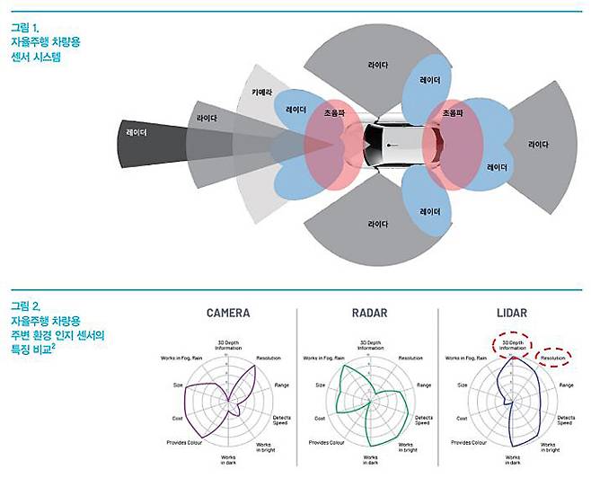 라이다는 레이저를 이용해 주변 환경의 거리, 방향, 위치 등을 측정하는 센서로 높은 해상도와 매우 정확한 거리 측정 능력을 갖추고 있다.3 그리고 초당 수백만 회 이상의 레이저를 방출하여 주변 환경을 빠르게 스캔할 수 있다. 이를 통해 라이다는 실시간으로 주행 경로를 계산하고 조정하는 데 매우 유용하며, 라이다를 탑재한 자율주행 차량이 복잡한 환경에 노출되어도 주변 환경을 빠르고 정확하게 인식할 수 있다는 특징이 있다. 또한 레이저를 사용하므로 주변 환경의 밝기에 구애받지 않는다. 이는 낮과 밤 모두 사용할 수 있음을 의미하며, 자율주행 차량이 어떤 시간에도 주변 환경을 인식할 수 있도록 만들어 준다. 다른 센서들과 비교해서 라이다의 가장 큰 장점은 조감도(Bird’s eye view)를 생성할 수 있으므로 좀 더 포괄적인 조망을 3차원 형식으로 제공할 수 있다. 하지만 라이다는 다른 센서들에 비해 비교적 가격이 높으며, 크고 무거운 편이라는 단점이 있다. 최근 라이다 개발 업체들은 이러한 문제를 극복하기 위해 소형화, 경량화, 제조 원가 하락 등에 기술 개발 초점을 맞추고 있다. 이러한 단점에도 불구하고 라이다는 우수한 해상도와 거리 정보를 제공한다는 장점으로 이종 센서와 함께 사용될 때 자율주행 시스템의 성능을 높여준다. 따라서 라이다는 자율주행 차량에서 필수적인 역할을 함과 동시에 최적의 결과를 제공하는 센서로서 적용되고 있다.