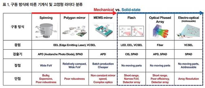 모빌리티 산업에서 자율주행 목적으로 라이다의 활용 분야가 늘어나면서, 소형화, 경량화, 고내구성을 위한 연구 및 개발이 집중되고 있다. 이에 따라 구동부를 활용한 기계식 라이다의 일부 한계점을 극복하기 위한 방향으로 추세가 변화하며 기술 고도화가 진행되고 있다. 반도체 소자를 사용한 고정형 방식(Solid-state)의 라이다