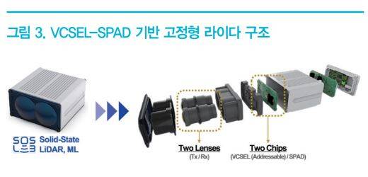 기 위해 SPAD(Single-photon Avalanche Diode, 단일광자 포토다이오드)를 송수광원으로 활용하는 방식을 <그림 3>과 같이 개발하였다. 이 구조의 경우 Flash 구조와 유사하나 각각의 광원을 원하는 형태로 조사할 수 있어, 상대적으로 높은 세기의 빛을 생성하여 장거리 측정에 유리하다는 장점과 높은 해상도도 함께 가져갈 수 있다. 또한 광원을 배열 형식(Array)으로 만들어 여러 광원을 교차로 사용하게 되므로 내구성 측면에서도 장점이 있다. 에스오에스랩은 이러한 VCSEL-SPAD 기반의 완전 고정형 라이다 개발에 성공하였고, 현재 다수의 Tier-1 업체들과 차량 탑재를 목표로 양산 제작을 위한 공동 개발이 진행 중이다.