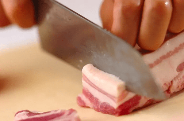 먼저 삼겹살은 먹기 좋은 한입 크기로 썰어 준비한다. 너무 작으면 조리 중 퍼지기 쉽고, 너무 크면 양념이 잘 배지 않기 때문에 적당한 크기를 유지하는 것이 중요하다. 지방과 살코기가 적절히 섞인 삼겹살을 사용하면 조림 중에 기름이 너무 많지도 않고, 씹는 식감도 더 좋아진다.