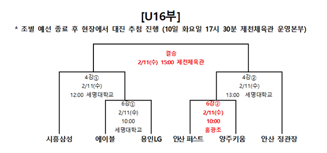 마찬가지 U16부에서도 6팀이 결선에 진출했다. 시흥삼성과 안산 정관장이 4강에 직행했고, 에이블-용인LG, 안산 퍼스트-양주키움은 6강 전을 통해 4강 진출을 다툰다.