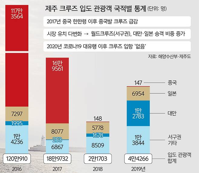 국내 입항 크루즈 관광객은 2017년부터 큰 폭으로 감소하기 시작했다. 2016년 195만3777명(791회 입항)을 기록했으나, 2019년 26만7381명(165회 입항)으로 크게 줄었다. 2019년 방한 크루즈 관광객은 일본, 대만, 미국, 호주, 캐나다 순으로 나타났다. 2017년 사드(THAAD·고고도미사일방어체계) 배치에 따른 중국의 한한령 이후 중국인의 발길이 끊겼기 때문이다. 2017년 이후 방한 크루즈 시장이 중국에서 일본·대만 등으로 바뀌고 해양수산부 등 공동 협력 세일즈를 통한 월드와이드 크루즈의 점진적 증가가 눈에 띈다.