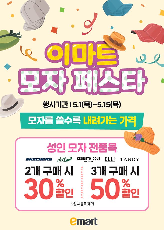 먼저, 이마트는 모자 전 브랜드 통합 할인 행사를 선보인다.