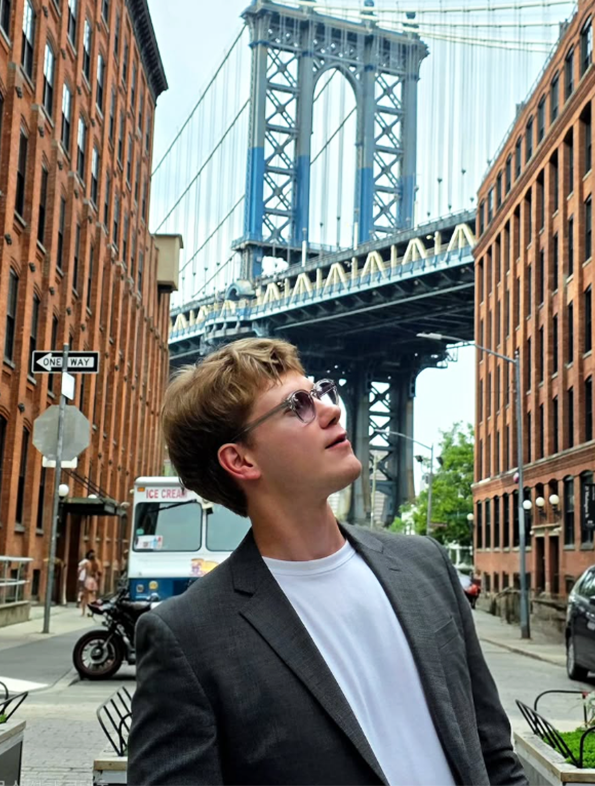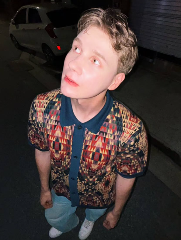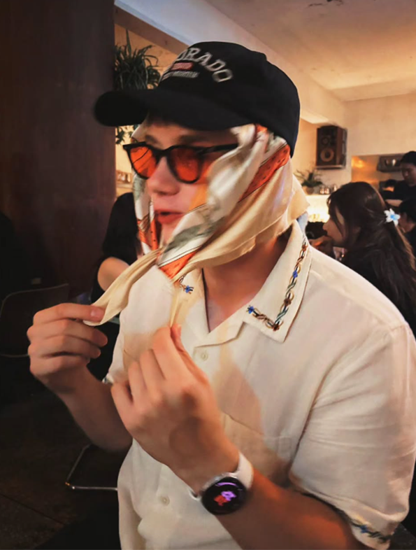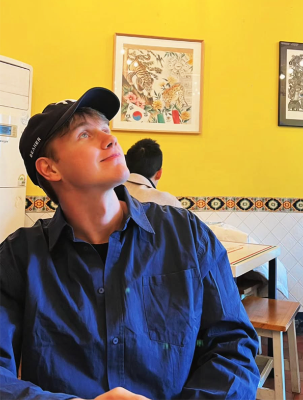 셔츠의 컬러와 조화를 이루는 밝은 블루 팬츠는 전체 룩에 통일감을 더하며, 포멀함보다는 여유로운 스트리트 무드를 연출한다.