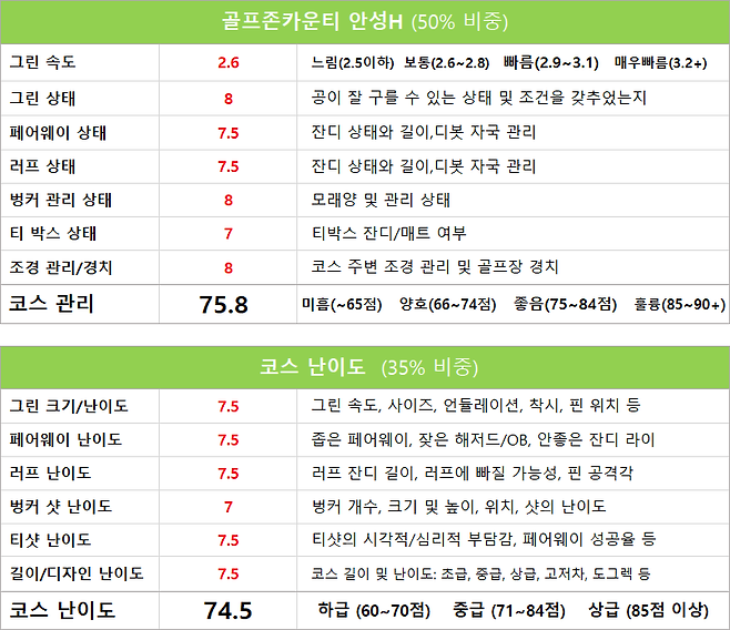 처음 들어보고 가본 골프존카운티 안성H 골프장은 기대 이상으로 관리 잘 되었고 코스 레이아웃도 아주 좋았습니다. 전체 홀 길이와 난이도 모두 적당히 길었고 억지스러운 홀은 안 보인듯합니다. 수도권 주변에 이같이 우수하면서도 가성비 좋은 골프장으로 미처 몰랐다는 게 신기할 따름입니다.
