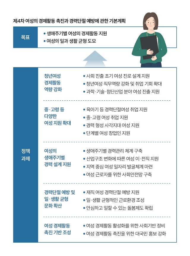 2022년 6월 ‘여성경제활동법’이 전면 개정되면서 해당 대상이 ‘경력단절여성’에서 ‘청년·중장년·고령 등을 포함한 다양한 여성’으로 확대됐습니다. 이에 기본계획은 여성 생애 전반에 걸친 경제활동 지원을 강화하는 데 무게가 실렸습니다. 정부는 ‘여성의 경제활동 확대를 통해 함께 성장하는 지속가능한 미래’라는 비전 아래 생애주기별 여성의 경제활동 지원, 여성의 일과 생활 균형 도모 등 2대 목표를 세웠습니다. 정책과제는 ▲청년여성 경제활동 역량 강화 ▲중·고령 등 다양한 여성 지원 확대 ▲여성의 생애주기별 경력설계 지원 ▲경력단절 예방 및 일·생활 균형 문화 확산 ▲여성 경제활동 촉진 기반 조성 등 5개 분야에서 추진됩니다.