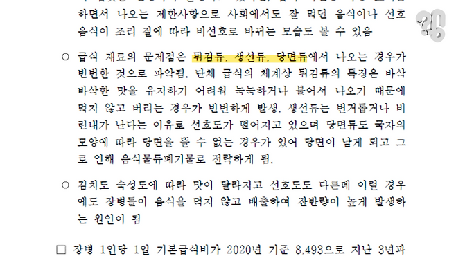 한 보고서를 보면, 군부대에서 가장 많이 남기는 음식은 생선류, 튀김류, 당면류가 꼽혔는데 생선과 튀김은 시간이 지나면 눅눅해지거나 비린내가 나고, 당면류는 국자 종류에 따라 면을 건져내기가 힘든 문제때문에 잔량이 많다고 지적했다. 고등어순살조림이나 명태순살튀김, 조기튀김이 괜히 최악의 음식에 들어가있는 게 아니다.