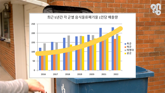 군대에서 연간 1명당 버려지는 음식물 쓰레기가 얼마나 될까. 육군은 231㎏, 해군은 169㎏, 해병대는 195㎏, 공군은 185㎏이나 된다. 365일로 나누면 하루에 대략 460g~630g정도를 1명이 매일 버린다는 얘기. 일반 국민 1인당 음식물 쓰레기 평균 발생량이 연간 92㎏인 것에 비하면 2배 이상 많다는 계산이 나온다. 최근 추세를 봤더니, 이렇게 전군에서 음식물 쓰레기가 매년 늘어나고 있었다.
