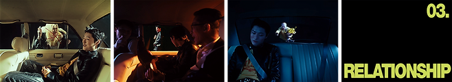 세 번째 영상은 자동차 뒷좌석을 배경으로 하고 있네요.🚙 이번 영상의 키워드는 ‘RELATIONSHIP’으로 다양한 사람들과의 관계 및 서사를 그려내고 있습니다. 짧게 스친 듯 보이는 금발 여성과의 인연을 드러낸 ‘NA NA NA’, 지루한 비즈니스 상황을 보여 주는 ‘BEEP’, 꽃다발을 들고 따라오는 노인과 복잡한 마음을 그려낸 ‘사모’, 처절한 이별을 보여 주는 ‘CINEMA’까지 자동차의 내외부 공간을 폭넓게 활용하고 있는 연출이 매우 인상적이네요! 살아가며 마주하는 다양한 관계와 그 속에서 비롯되는 감정들을 음악으로 풀어냈음을 암시하는 듯합니다!
