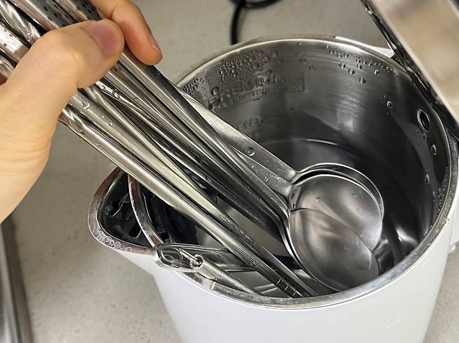 물이 다 끓으면 소독할 수저를 집어넣은 후 5분간 기다리세요. 전기포트를 활용하여 소독하면 굳이 가스레인지에 물을 끓이지 않아도 돼 훨씬 편리합니다.