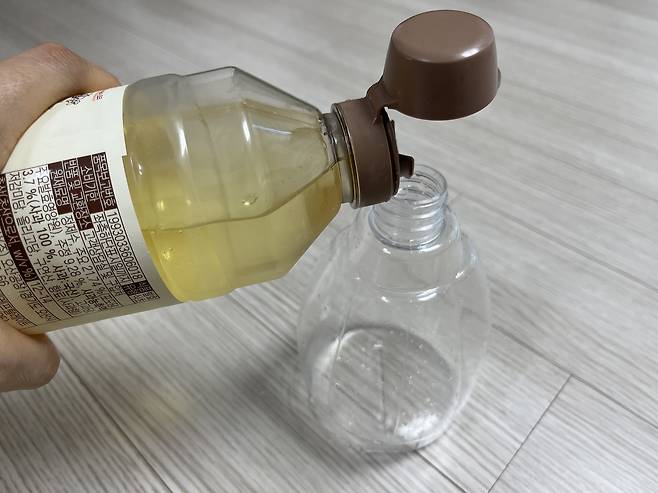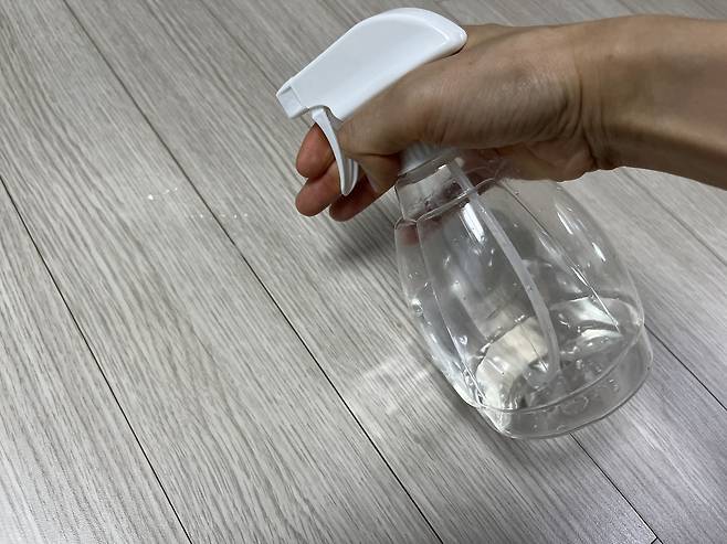 여름철에는 습한 날씨 탓에 방바닥이 끈적끈적 거리는 경우가 있습니다. 그냥 두면 걸어 다닐 때마다 발에 감기는 불쾌한 느낌 때문에 찝찝한데요. 그럴 때 분무기에 물과 식초를 10:1 비율로 섞어 줍니다.