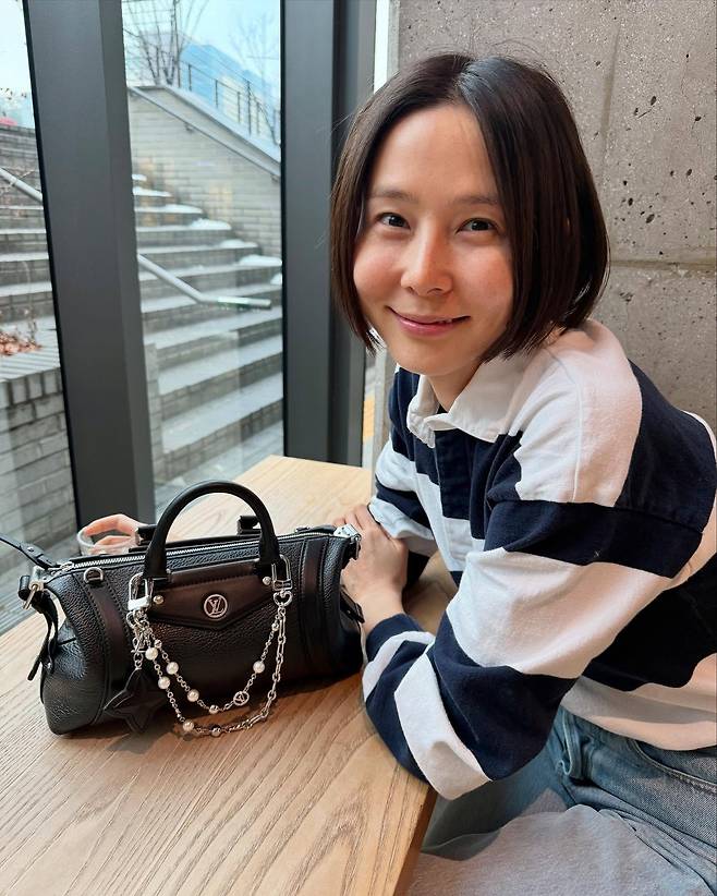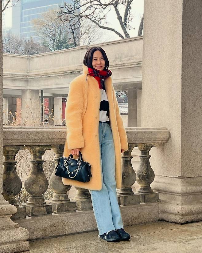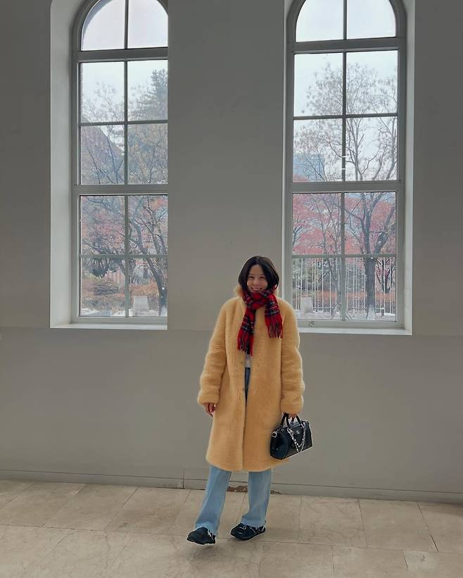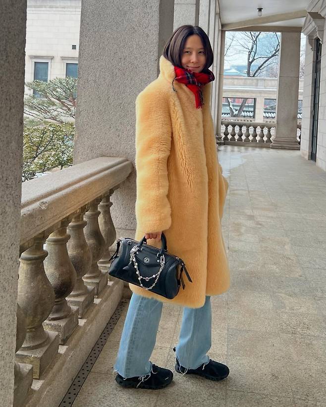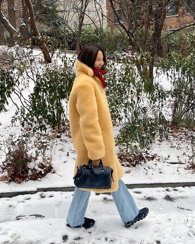 사진 속 김나영은 샛노란 퍼 코트에 체크무늬 머플러를 포인트로 주고 루이비통 가방을 매치했습니다.