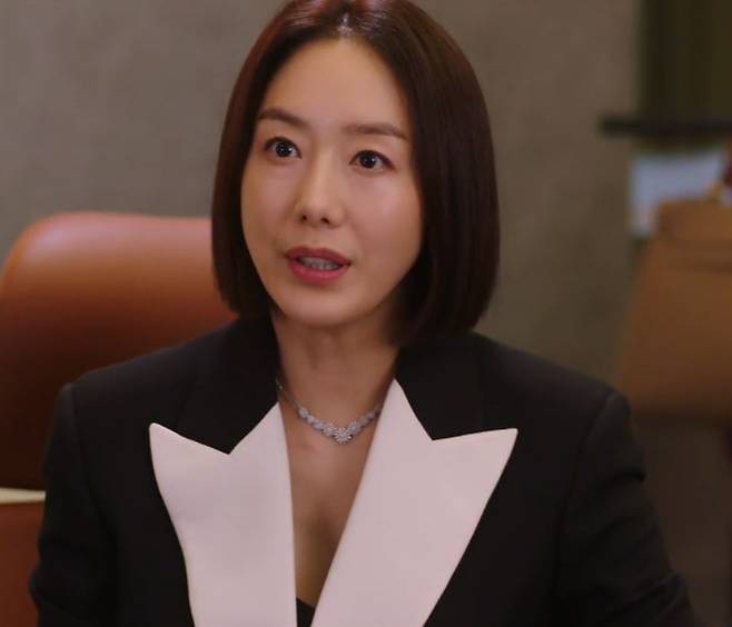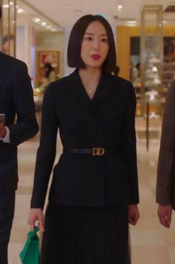 블랙과 화이트 배색의 테일러드 재킷은 단정하면서도 날렵한 실루엣을 강조했고, 플리츠 디테일이 더해진 스커트 수트는 무게감 있는 캐릭터와도 자연스럽게 어우러졌다.