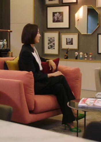 실내 장면에선 과감한 블랙 팬츠 수트에 선명한 그린 스틸레토 힐을 매치해 포멀룩에 경쾌함을 더해주었다.