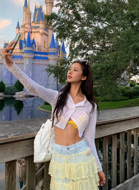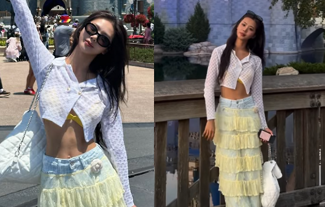 천미경은 최근 여행 중 공개된 일상룩에서 유니크한 스타일을 선보였습니다. 그녀는 화이트 크롭 가디건에 데님 팬츠를 매치해 탄탄한 복근을 자랑하며, 라이트한 청바지 위에는 시스루 캉캉스커트를 레이어드하여 여유롭고 세련된 여행룩을 완성했습니다.