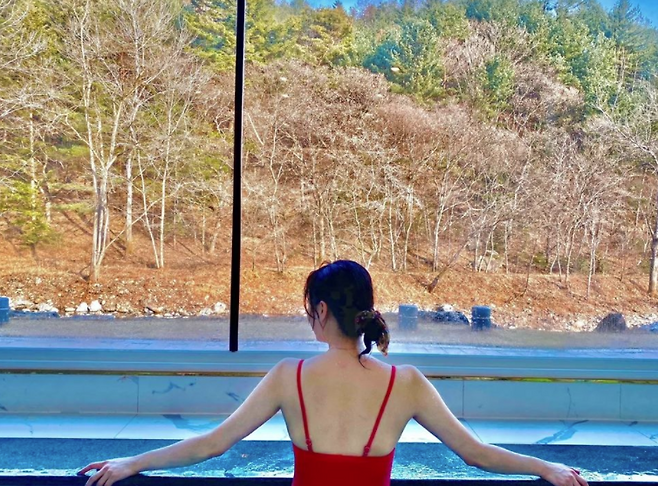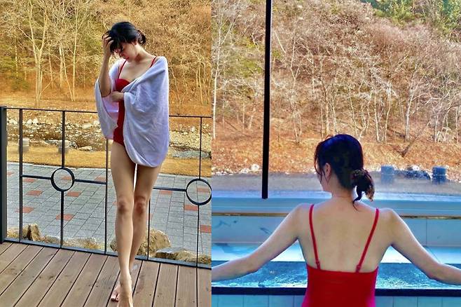 고은아는 그린 컬러 수영복 뿐만아니라 레드컬러 수영복도 선보였다. 수영장을 배경으로 사진이 잘 나오는 컬러인 레드를 선택해 눈길을 끌었다.