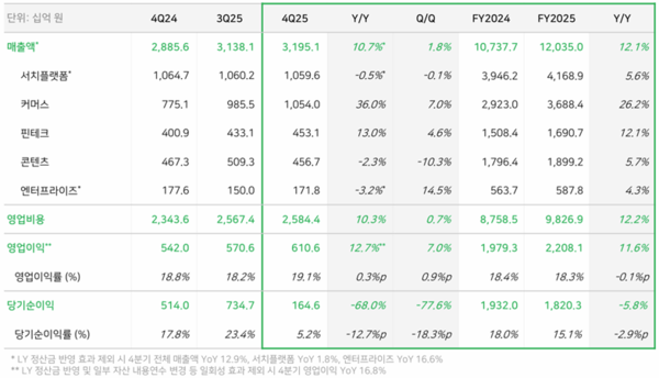 또한 네이버는 2026년 1분기부터 핵심 사업과 신규 사업 기회를 명확히 반영하기 위해 매출 구분을 △네이버 플랫폼(광고, 서비스) △파이낸셜 플랫폼 △글로벌 도전(C2C, 콘텐츠, 엔터프라이즈)으로 변경한다.