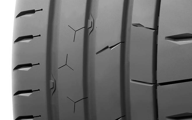 MC6의 후속 맥스콘택트 MC7의 첫인상은 '견고함'이다. 바깥쪽 트레드 블록의 좁은 그루브 안에 촘촘하게 브릿지를 세워 높은 하중에 대항한다. 콘티넨탈은 브릿지들에 스태빌라이저 바(Stabilizer Bar)라는 이름을 붙였다. 삼각별 그리고 번개(Star & Lightning) 형태의 사이프들은 예리하게 디자인됐는데, 이를 통해 트레드 블록의 강성을 비롯해 접지면적을 높이려는 의도를 읽을 수 있다. 매운 고추 형태의 아쿠아(Aqua) 사이프 형상도 흥미롭다. 전반적으로 깊이감 있는 그루브를 중심에 두고 사이프를 자잘하게 나눠 트레드에 새겼던 MC6와 다른 형상이다.