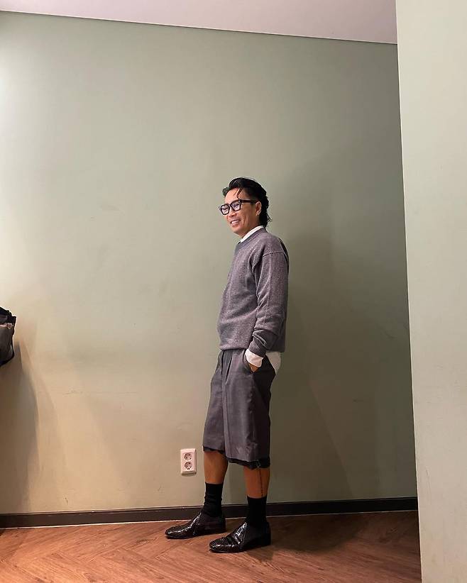 그레이 스웨트 셔츠 + 화이트 셔츠 레이어드에 버뮤다 팬츠와 블랙 로퍼 조합.
