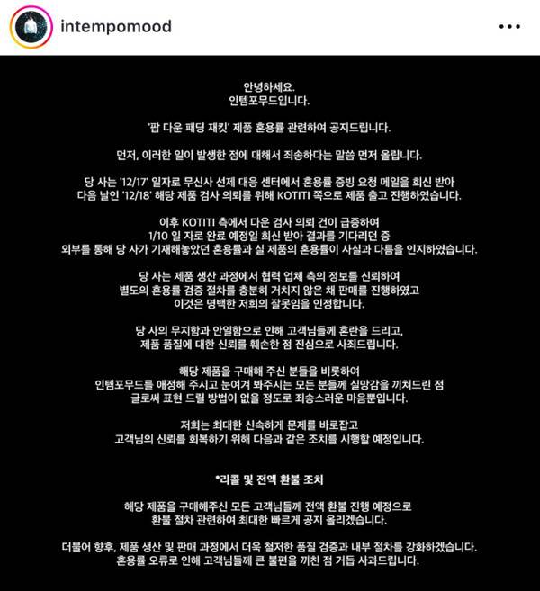 인템포무드는 문제가 제기된 패딩 제품에 대한 전액 환불처리를 진행하고 있다.