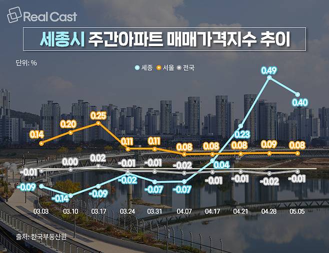 한국부동산원에 따르면, 5월 1주차 주간아파트 매매가격지수에서 세종시는 전주 대비 0.40% 상승해 전국 17개 시도 중 1위를 차지했습니다. 이는 4월 4주차 0.49% 상승에 이어 두 번째로 높은 수치로, 최근 세종시 부동산시장의 강세를 단적으로 보여주는 사례입니다. 같은 기간 서울의 상승률은 0.08~0.09%에 그쳤습니다.