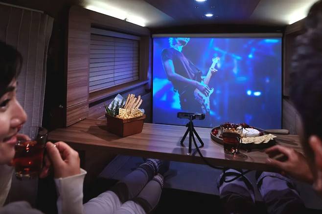 실내는 차박과 주거 환경을 고려하여 디자인됐다. 특히, 차량 뒤쪽의 대부분 공간을 따뜻한 톤의 목재 패널로 마감하고, 바닥은 평탄화시켜 공간 활용성을 극대화했다.