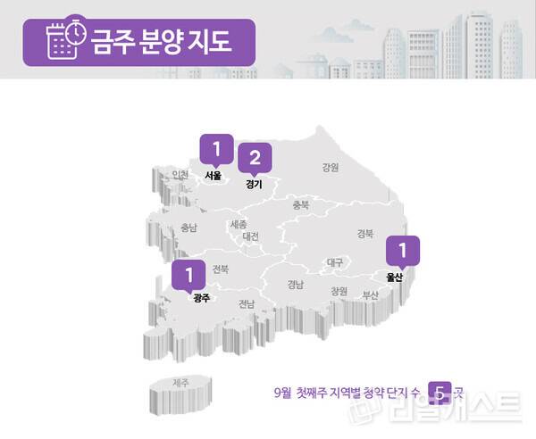 부동산인포에 따르면 9월 1주 전국에서 신규 청약 및 입주자를 모집하는 곳은 5곳, 총 3495가구로 집계됐습니다(총 가구수 기준).