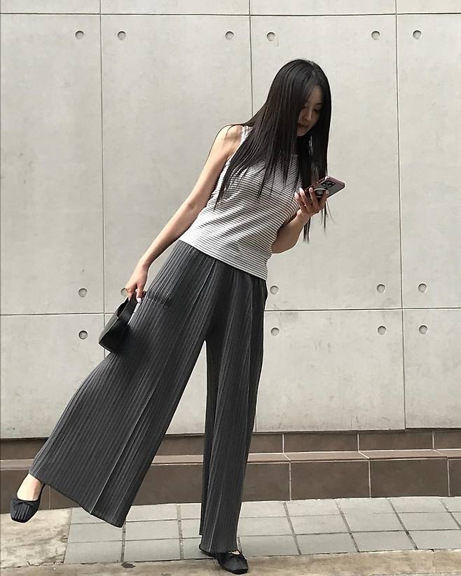 얇은 스트라이프 민소매 탑은 단정하면서도 가볍고 시원한 인상을 주고, 하의는 치마처럼 보이지만 실제로는 주름이 살아 있는 와이드 팬츠로 활동성을 더했어요.