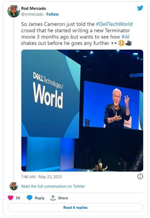 24일(현지시간) ‘델 테크놀로지 월드 2023’ 행사에 참석한 관계자들은 트위터를 통해 “카메론 감독이 3개월 전부터 새로운 ‘터미네이터’ 영화의 각본을 쓰고 있지만 인공지능(AI)의 방향이 명확해질 때까지 완성을 미루고 있다”고 전했다.