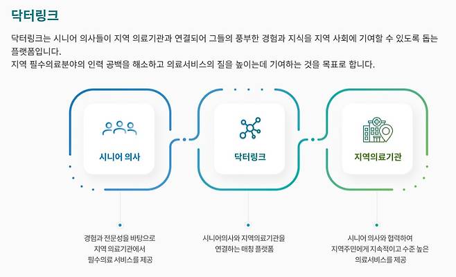 참여를 희망하는 의사는 닥터링크를 통해 인력 풀(pool) 등록 및 기본 정보를 입력하면, 채용 정보 확인, 사업 안내, 기관 매칭 연계까지 원스톱으로 지원받을 수 있다.
