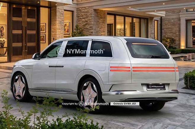 신차 예상도 유튜브 채널 ‘뉴욕맘모스’가 공개한 GV90 예상도는 GV90 출시 전 모습을 미리 예측해 볼 수 있을 만큼 높은 완성도를 자랑한다. 후면부는 좌우를 가로지르는 두 줄 테일램프가 적용됐으며, 테일게이트 파팅 라인으로 분리된 형태가 적용됐다.