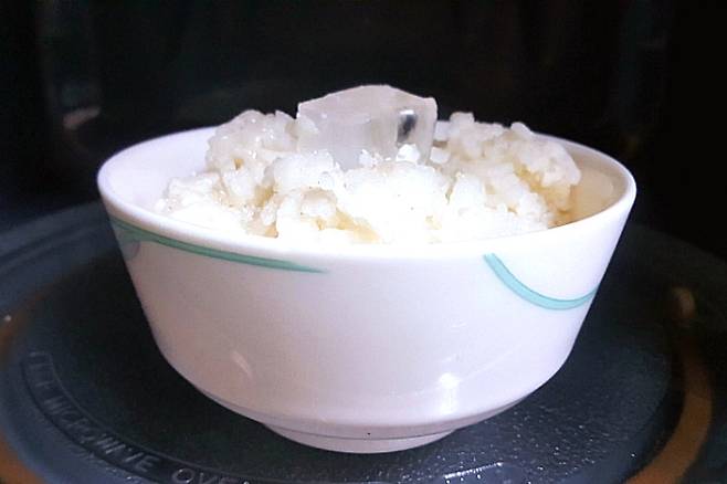 방법도 간단한데 냉동밥 위에 얼음 한 조각 올려주시면 됩니다. 밥 양이 더 많다면 2개 올려주세요.