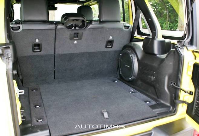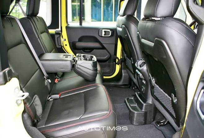 2열은 4도어답게 2도어 대비 여유로운 편이다. 시트 열선과 같은 편의기능은 없지만 전동식 유리창과 USB 포트가 있다. 랭글러 특성상 좌우 도어 트림의 도어 포켓은 그물망 형태다. 2열 중간좌석 등받이를 앞으로 내리면 2개의 컵홀더와 1개의 핸드폰 홀더가 있다. 참고로 랭글러는 액세서리가 상당하기 때문에 오너 취향대로 다양하게 꾸미는 것이 가능하다. 트렁크는 여유로운 편이다. 우퍼 스피커가 달려 있으며 옆에는 1개의 파워아웃렛과 하단부에는 트렁크 사물함이 구비돼 기능적으로 유용하다.