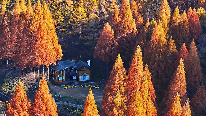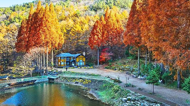 주황빛 메타세쿼이아 숲과 고요한 호수, 그 위에 비친 노란 집까지. 모든 것이 한 폭의 그림처럼 펼쳐지는 이곳은 최근 감성 여행자들 사이에서 조용히 입소문을 타고 있다.