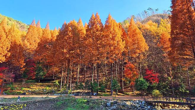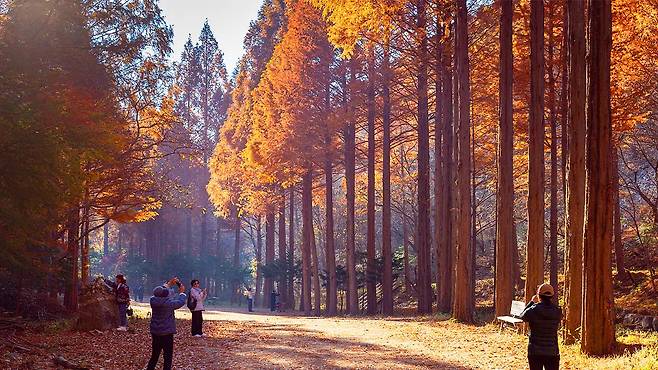 온빛자연휴양림은 단풍이 느리게 드는 편이어서 11월 중순 이후까지도 주황빛 숲을 즐길 수 있다. 특히 오전 11시 전후, 혹은 오후 2시 무렵, 낮게 떨어지는 햇살이 메타세쿼이아 줄기 사이로 부드럽게 스며들며 풍경에 깊이를 더한다.
