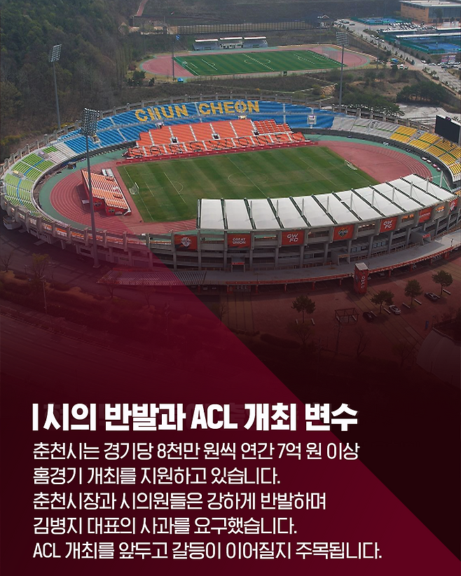 춘천시는 경기당 8천만 원씩 연간 7억 원 이상홈경기 개최를 지원하고 있습니다.춘천시장과 시의원들은 강하게 반발하며김병지 대표의 사과를 요구했습니다.ACL 개최를 앞두고 갈등이 이어질지 주목됩니다.