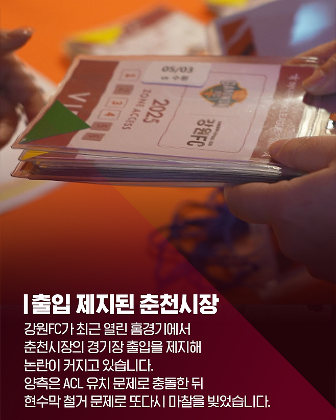 강원FC가 최근 열린 홈경기에서춘천시장의 경기장 출입을 제지해논란이 커지고 있습니다.양측은 ACL 유치 문제로 충돌한 뒤현수막 철거 문제로 또다시 마찰을 빚었습니다.